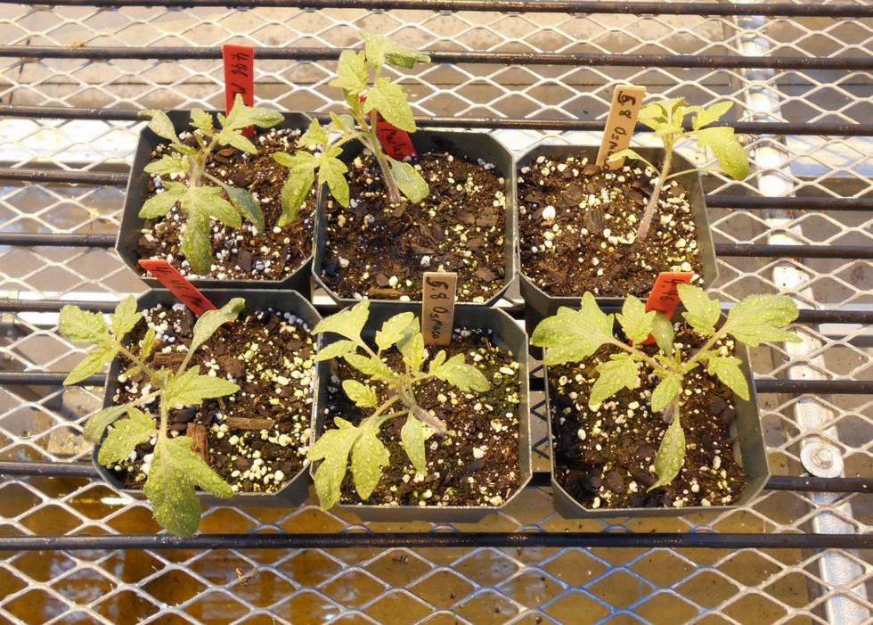 I moved the tomato plants and here they are under more natural light and not the strange orange light produced by the HPS (High Pressure Sodium) grow lights. So far they are in good shape and are maintaining a stocky stem which I will have to watch as they are removed from the intensity of the supplemental light they have been under.