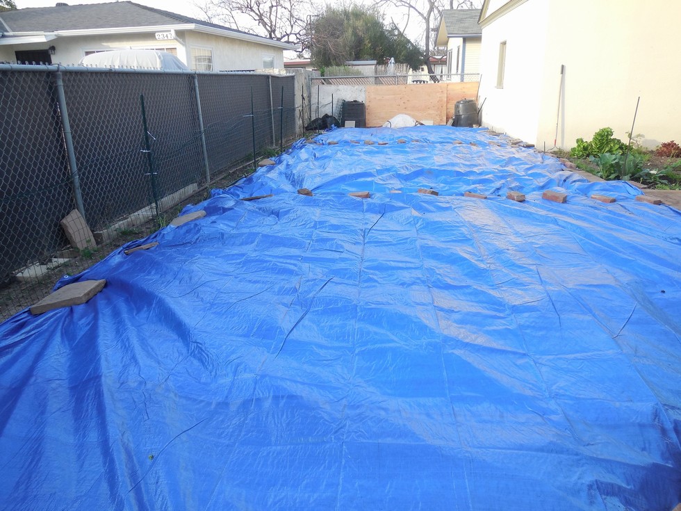 I let the mustard just start to flower about the end of January,,,, mowed down then tilled it in. All the soil was watered heavy then 2 large tarps were placed on top of the soil and sealed tight. The idea was to get the most out of the biofumigation and keep as much of the glucosinolate gas in the soil as I possibly could. I was told just watering it heavy would be fine but I'm not a " Just Fine " kindda guy:) Its all or nothing.