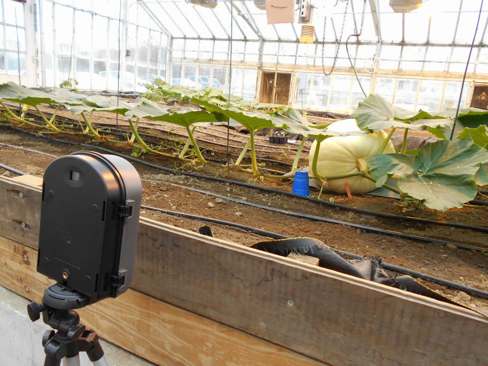 This year there is the addition of a time lapse camera to be able to watch the pumpkin grow. Its current interval is one picture every hour. Not sure how it will turn out but it is worth a try. From day to day the pumpkin is visually growing but it will be interested to see the potential changes over time. (The blue cup is placed in view for a size comparison.)