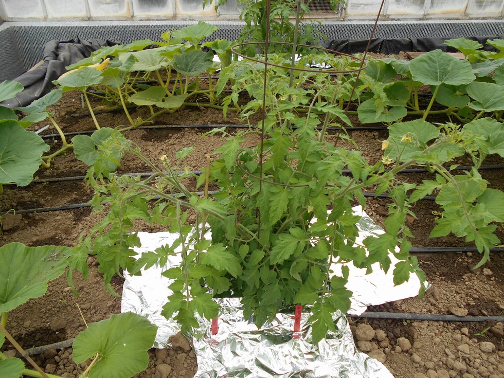 Clearly, there were a few side vines that did not make it into the supporting cage;-) While this does help with increasing air circulation it also makes supporting them a bit of a challenge. As you can see, more reflective sheets of aluminum foil have been added to increase the area for light reflection to match the increase in leaf canopy.