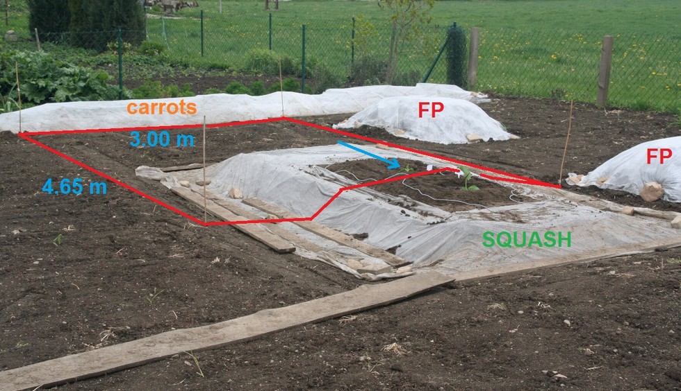 This is my 150 sqft patch for 2014, it has the shape of a long rectangle. The contest plant is growing back to back with a squash. Looks like FlatNorm isn�t the only one who forgot to bring the size reference beverage can for the first photo , I need to work hard...need to remember to bring a can with me to the patch.
