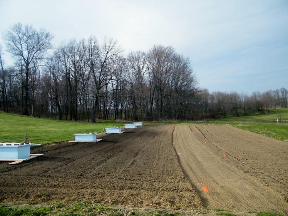 What a difference a few days can make! Last week I worried the soil would never be dry enough to till. Today its tilled with needed amendments and other goodies. Huts are in place with candles and thermometers. Garden cart path is packed down. The area to the right of the path will be growing 25 party pumpkin plants.
