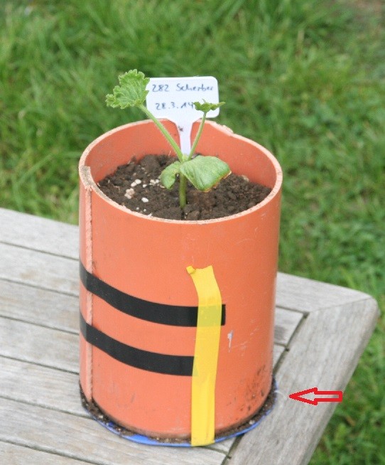Had mentioned the 282 Scherber plant yesterday, but then came to the conclusion that a pic can tell much more. Let�s see how this plant will develop. BTW, the red arrow points at a root coming out of the bottom of the plant tube. Thus, I transplanted it into a bigger pot today. Maybe it was just lack of soil which had kept the plant at bonsai size, LOL.