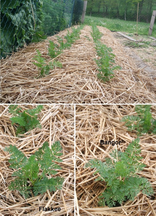 Time for a carrot update. This year there are Flakkee and Bangor carrots in my patch. Currently there�s not much difference between the two varieties. The Bangor plants look somewhat stronger than the Flakkee plants (although they are about two weeks younger).