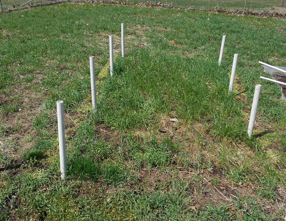 In an effort to try and dry and warm the soil up ahead of time I set-up the cold frames early and while they were not plant ready, there was an increase in temperature. If you look at the rye grass, even though the plastic has been removed you can see the area that was under protection. Even though this protection was only up for about a weeks� time it did make a difference. The rye is taller and deeper green in a rectangle;-)