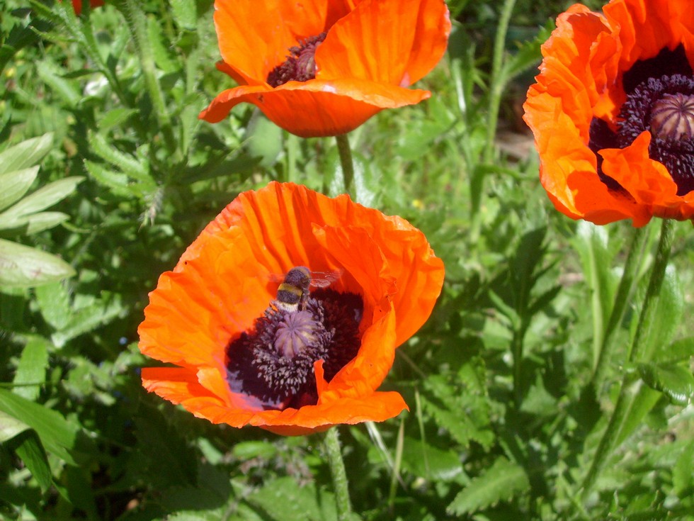 As today is the 70th Anniversary of the D Day landings, I was photographing the poppies in my garden, when a bumble bee flew in to do his thing.