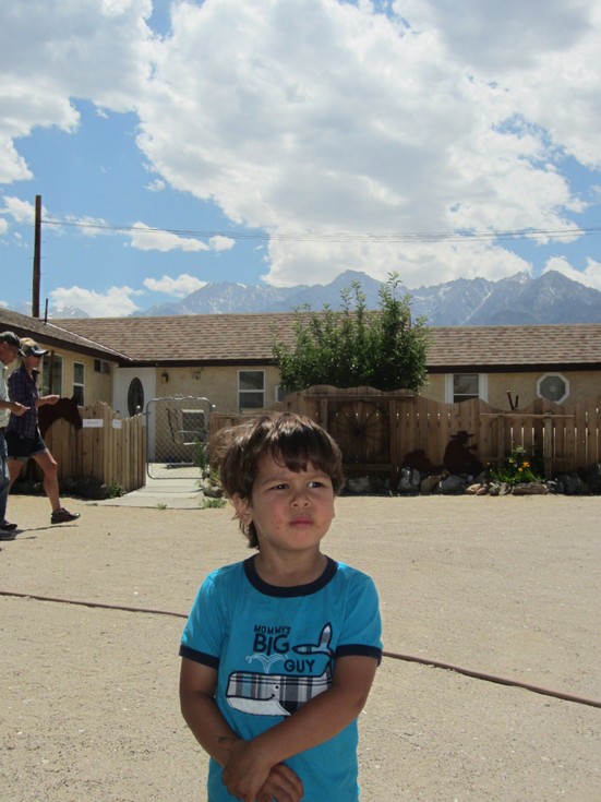 Sierra trip 2014!! Joshua at Grandpa's motel with the towering mountains behind just arriving. 3 generations, my dad, me and my son.