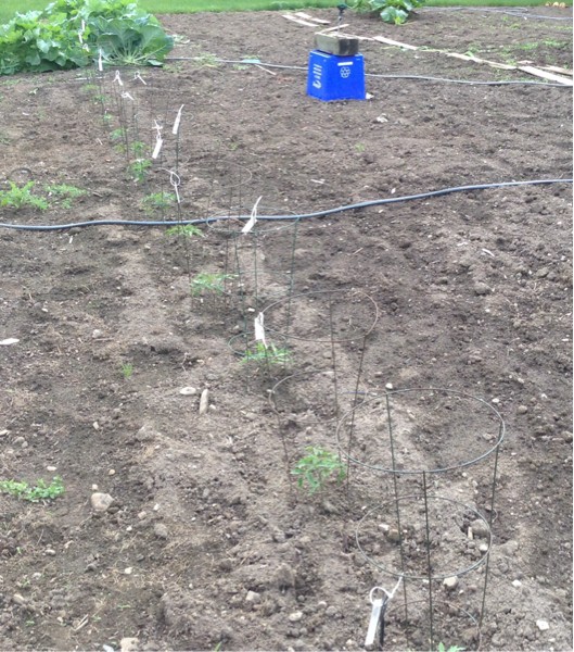 Tomatoes just went last weekend. I have 24 plants total. Twelve in cages on one side of the patch and twelve on the ground on the other side. I have a fertilizer impregnated paper mulch that I'm going to try with some of the tomatoes.