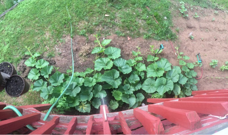 Looks like the extras aren't getting thinned out. From weed waker yet. Maybe this weekend I will get to the weeds and the extra vines. I believe there's four maybe five plants there. Last year I grew two plants in this area and got 4 pumpkins all around #150 on the lawn/weeds.