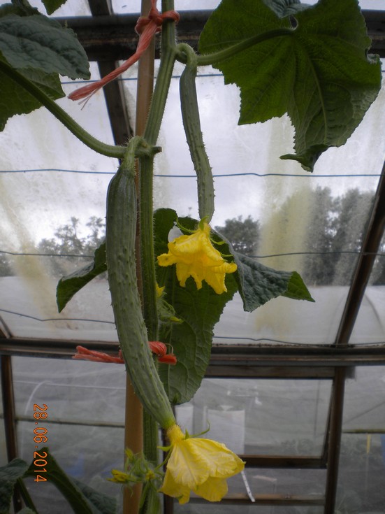 Giant Cucumbers starting to bear female flowers, this plant has two together and I will reduce to one in a few days. At present the plants are very healthy, however two near the door have an aphid attack so will have to spray.