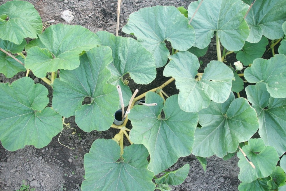 Started to create an S-curve in the main vine of my 1209 Shenoha plant. It�s only 2 days after pollination, but I don�t want to wait too long with S-curving the fruit position out of the idealized straight main vine direction. This curve is smaller than one might think (because of the short internodes of this plant). The fruit is about 1.5 ft from the idealized straight line of the main vine.