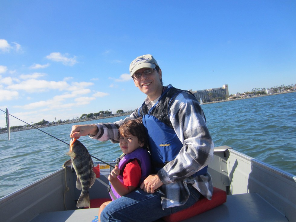 went in the boat with the whole family in san diego bay. Took 7 month andrew too! Just for fun, but I threw the pole a few times with Joshua, here is a nice bay bass! They fight hard like small mouth, aggressive little suckers:)
