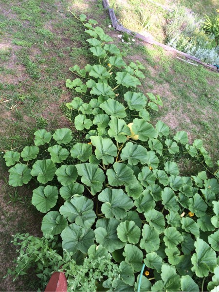 Okay this plant is showing the same yellow sides tips point straight up has been for a couple weeks this is a back up on my so-called lawn and has a pumpkin growing a little faster every day my largest pumpkin so far it looks like it gained its most yesterday and started to split it stem area