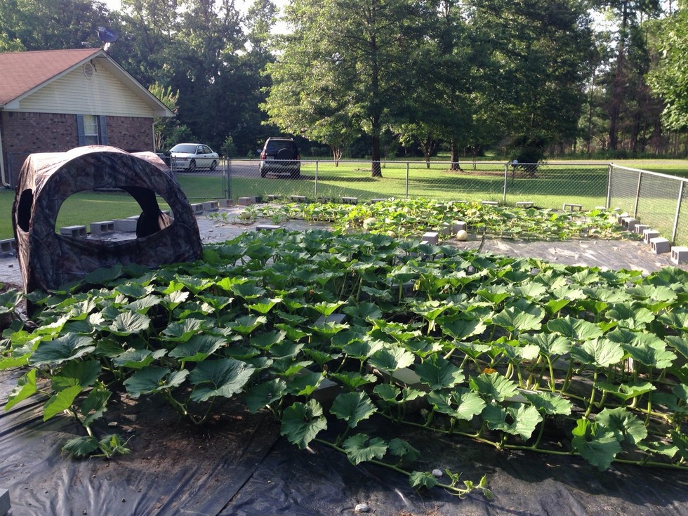 View of the plant mass. So far I just have a few leaves around the stump that are yellowing or dying off due to some cause, deficiency or abuse. It's not plantwide white powder or anything, but I am keeping my eyes peeled. I'm also seeing a few squash bugs here and there, so I dusted with SEVIN. I decided I do not like the dust due to the potential to breath the powder in days after application (while pruning and working within the patch). Next time I'll buy the liquid concentrate and apply with a broadcast water hose sprayer, and regiment it to once every week or two.