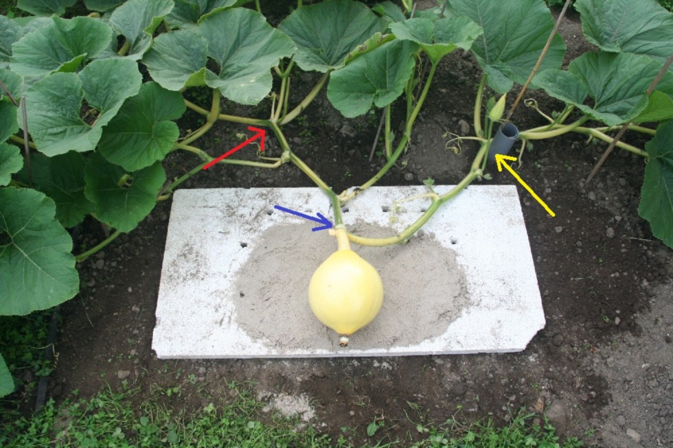 Finally I removed the sticks at the red-arrow and blue-arrow positions and I placed something under my pumpkin. In this case it is a sheet of styrofoam, where I cut a good number of holes in, and then I covered it with fine sand. You see that I placed this sheet of styrofoam in such a way under the fruit that there�s much styrofoam at the stem side of the fruit. Reason is, the fruit will grow in all directions. At the blossom end I can easily add another sheet, but as the fruit grows and the vines in the back of the fruit turn into a dense jungle it will be impossible to add more styrofoam at the stem side of the fruit. Let�s see what happens as this fruit grows (hopefully it will grow for the next 10 weeks). My guess is that the junction between vine and stem will then rest at about 1 - 1.5 ft above ground, somewhere between the red-arrow and yellow-arrow positions.