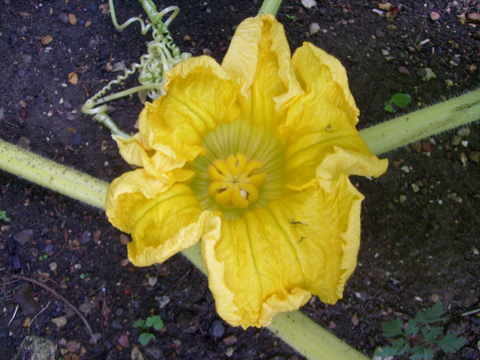 The 2 previous attempts at pollination on the yellow vined 874 Geyelin both seem to have taken as they are now both the size of tennis balls. Unfortunately they both had seeds in the female flower....so this morning I pollinated this 874 Geyelin on the yellow vined (bigger) plant...it's about 13 feet out and I managed (oops!) to break the main vine off about 8" beyond this flower...so it will be the last on the main vine if I can get it to take....fingers crossed. The flower had one single seed showing under her carpels and I had to protect her from a bee buzzing around as I was trying to pollinate....although it is nice to see plenty of bees this week in the garden.