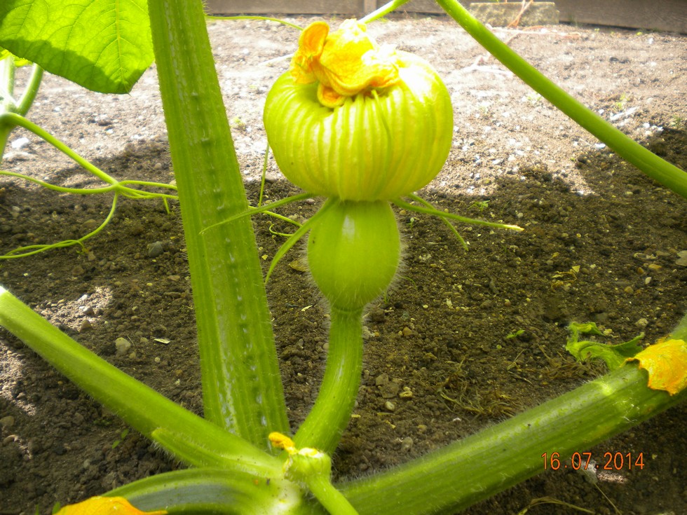 First female on my Squash plant (yes it looks like a Squash, pale green) pollinated with the only one male flower available late in the afternoon, hope it sets ok.