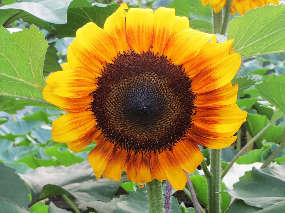 Early morning visits to the garden are surely made more pleasant when I see these guys. I enjoy watching these sunflowers develop almost as much as the pumpkins. This "bicolor" is part of a "wall" of sunflowers I planted to diffuse the south wind.