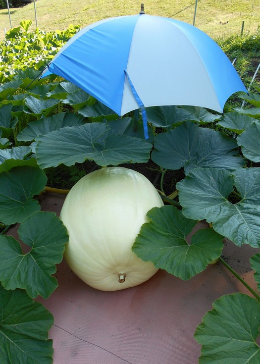 This is looking like it will be a barrel shaped pumpkin based at this point in time. The color is white, like I had last year so I would expect it to follow the same pattern and be a pink-ish color by the end of the season if it makes it that far. The plant is infected with virus but the plant is doing its best to keep the pumpkin growing. This pumpkin is actually one day ahead of where my 1676.5 Daletas plant was last year (when it was also at day 20) and if it was not for the virus I feel this could have been a very competitive pumpkin.