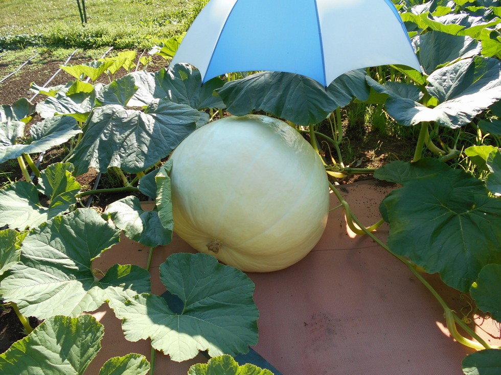 The growth rate of this pumpkin has been exceptional. What makes this particularly impressive is that the plant is stunted with leaf burn (both a direct result of the virus) and also has not filled the total area. The shape and color are what I expected but the growth rate is what we all dream of.
