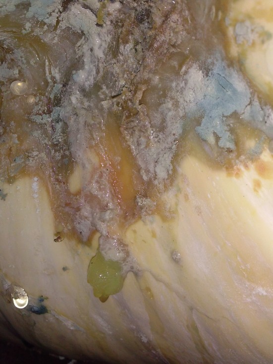 This pic and the next one are for all you disease guru's out there. WTH is going on with this plant? It's the Shenoha, and every single kin 'bleeds' like this. If I treat the kin everyday no rot sets in. For all the horrible look in this picture all that gunk comes out of the pumpkin. There are three kins on this plant, and they all 'bleed' a creamy white goo, and a yellow goo. Someone enlighten me. The plant is ridiculous- tons of growth, no stump or vine rot....just this bleeding pumpkin syndrome. UGH.