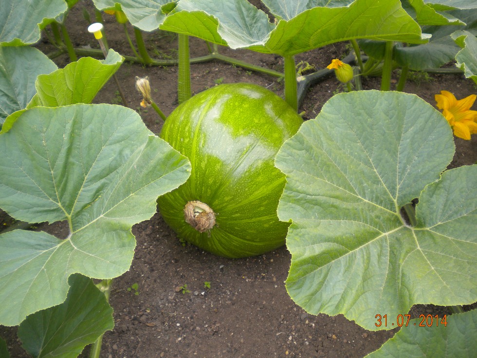 Green Squash has grow well during the hot weather, almost perfect round shape so far. Two others are now set on the plant so may remove one when I am sure which is the stronger.