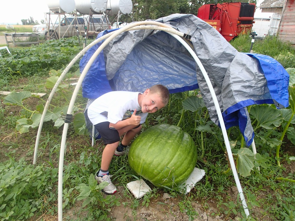 Alex's 825 Makarchuk. Almost all of his secondaries before the pumpkin shrivelled and died. The same happened with Andrew's plant, which was planted back to back with Alex's. They suffered with the excessive water back in June. He's got the back main and the secondaires past the squash. The plant is pretty small but the last few weeks has seen some growth. His squash is growing slowly, but he's still happy he's got something.