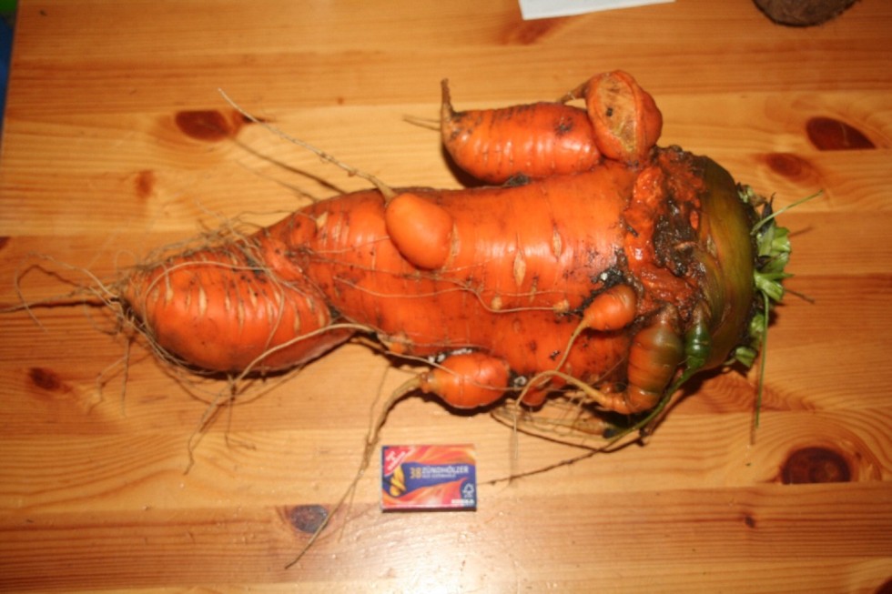 Had to pull this Bangor carrot today (its weight was 2.50 kg, i.e., 5.5 lbs). Found a soft area on the top part of this nice root and decided that it definitely won�t have the power to survive for the next six weeks. As I found that the Bangors are much more tasty than the Flakkee carrots, I decided to pull it now (and to have a nice carrot to eat...and to share with my guinea pig) rather than leaving it in the ground and then having a handful of mud.