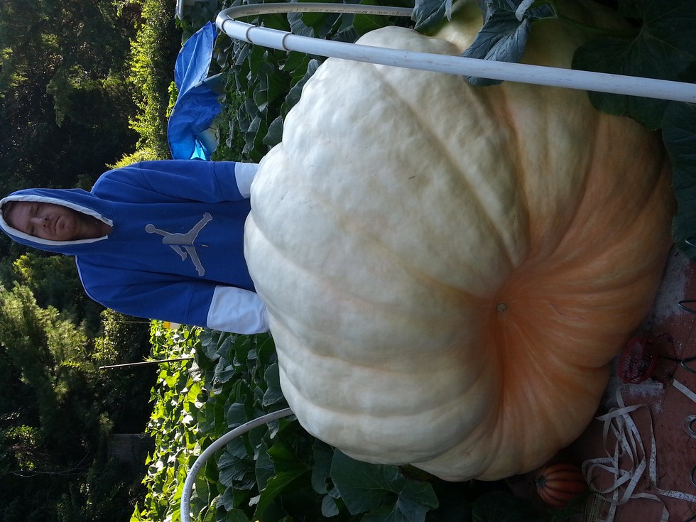 2009 Wallace Wally Coyote is 57 DAP and 415"OTT. 1484 LBS and no signs of netting. The pumpkin and plant look fantastic. Just getting a picture now because these warm days and cold night are really making me nervous. There are stretch marks in the blossom end and I'm scared to take blankets off kin in the morning.