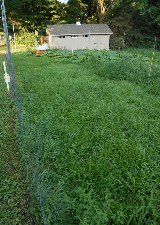 While it may not look like it on first glace I have been weeding the pumpkin patch regularly. While many growers want a perfect weed free patch my weeding has been directed toward dicot weeds and I have been leaving the grass species. The grass seed that I added has finally established and it has been out competing most of the other weeds I had starting. I should have good soil stabilization since I basically have a lawn on both the inside and outside of my pumpkin patch fence.