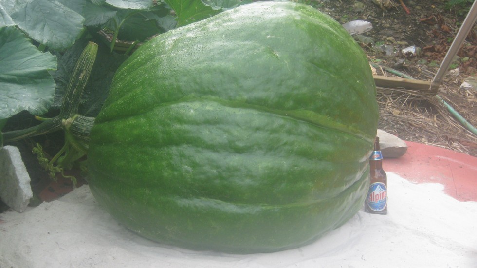Day 30 62.5"fb x 65"ss x 99"c = 226.5"ott = 263lbs. this fruit is not photogenic. hard to get good angle on her. the beer bottle is dead center of fruit. slow going with cold nights by the ocean and cloudy cool day's. at least very consistent growth as past 10 day's have all been 20lbs. doubt I will get 20 more days of 20lbs. but that's what I would like ;)