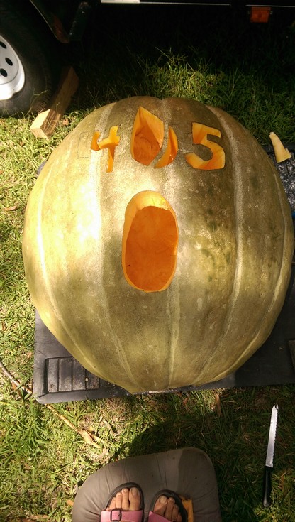 "405 Bond" all gutted and carved. 405 pounds and zero nutrients. 100 square feet of plant. Cool. She is a '200 bell x 89 Shymanski'. Blossom end was 7" thick.