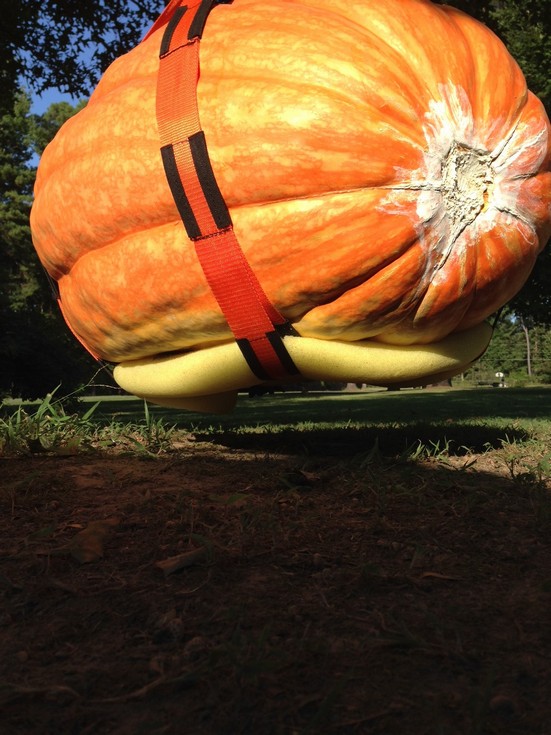 I used a pool noodle to protect the bottom loop, and moving straps made a X up and over to support the weight as it was hoisted. You can see the non existant stem covered in Daconil. Pumpkin integrety was great during lifting and transport (with the exception of the stem). It has held its shape and firmness well.