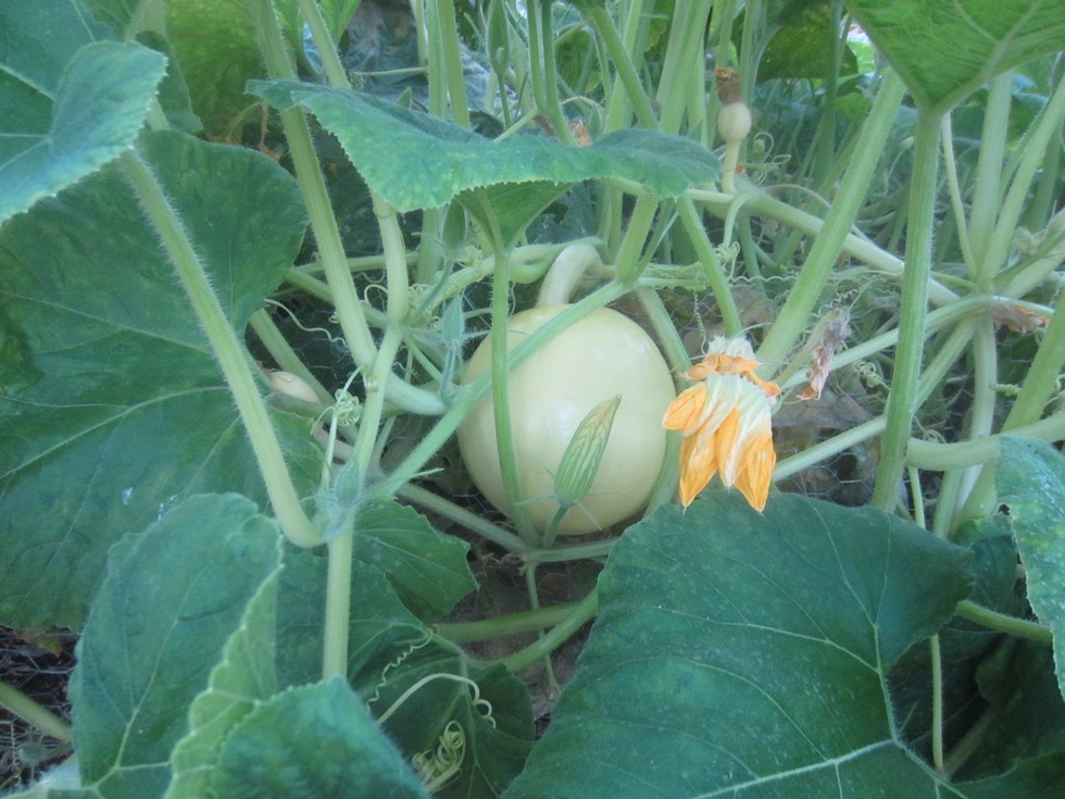 found one pumpkin in the jungle hanging from my chicken wire, interesting, some new fruit have mosaic symptoms, others do not.