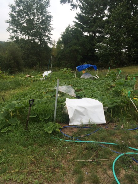 Another picture#700NE plant this is actually way more plant then I had behind my 700 pound pumpkin last season 2013 that plant also had two pumpkins. My biggest one on the main still has no netting at all I'm hoping September stays warm it seems as if the pumpkin wants to just keep growing very slow