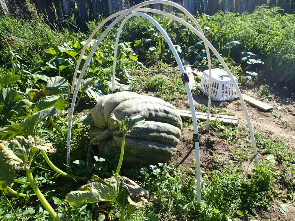 Beautiful Day. Sunny and 28. Unfortunately the forcast for Tuesday is rather scary. Time for the woolies. My season may come to a rather abrupt end, so here's what we have going now. This is Alex's squash. There's not much left of his plant before the squash and it hasn't grown much in the past few weeks.