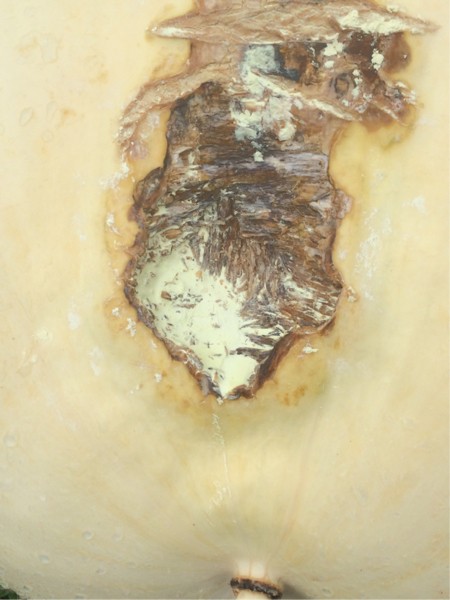 Don't even think we got to 55� today in the patch this photo is a back up plant with a pumpkin that had some unusual white spot that turned into this woodgrain looking stitch pattern scar i've Sulfur and it I've had to peel away some of the skin that was soft and rotten but the brown wood grain looking stuff is hard and the pumpkin seems to be growing real slow only around 100 pounds it was just a single Vine from my 625 seed grown in the lawn 1000 pound Grenchic offspring
