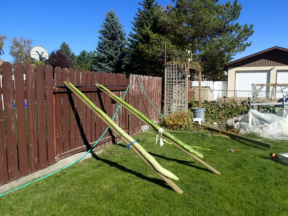 We had 3 nights of frost 10 days ago, but the squash and pumpkins are still putting on weight. The last week has been summer like weather. Back to watering again. Here's the two gourds for this year. July and August were really hot this year and the squash and pumpkins didn't like it, but the gourds did. Last year was really good, until the hail. The tips started curling on the boards as they got longer. I lost a few inches because of that. It won't happen again LOL. I need to get another few sheets of lattice (nothing is open in Taber on Sunday) and I'll be good for the spring. I need to remember the sunscreen. It was a hot and sunny day again. More in the forecast for this week.