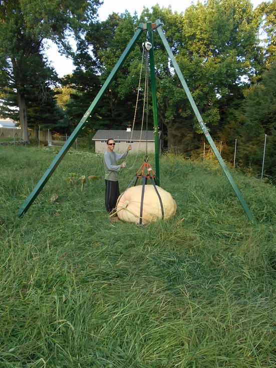 Here I am harvesting my Durham Fair entry, as you can see the virus infection killed almost the entire plant. Only 5 leaves remain and my grass cover crop has established itself nicely. This image also shows the modified Team-Pumpkin tripod as this style has couplers that join two eight foot 4�x4� wooden posts together. This allows this 16ft. tall tripod to be transported in a small car like a Honda Civic with ease. This does make handling and storing this once a year use item easier.