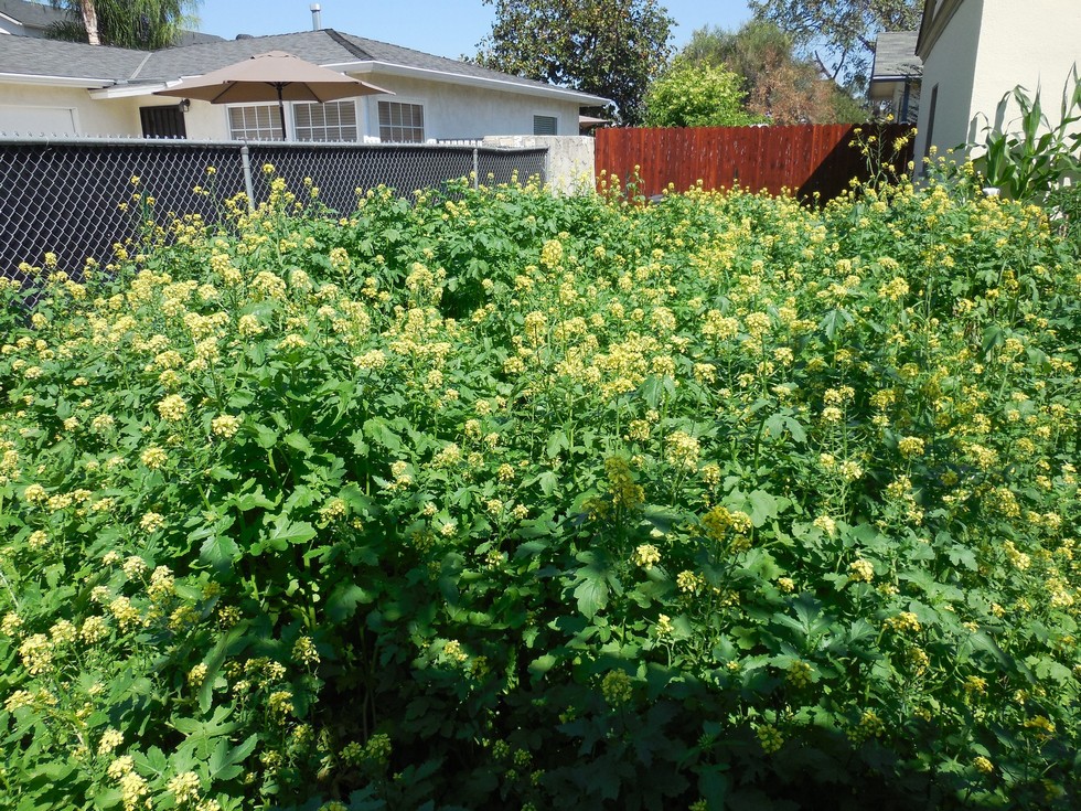 I let the mustard get up to about 5 feet and right before seed. Stuff grows fast in the summer heat so you really have to watch it. Stuff took over my entire backyard!