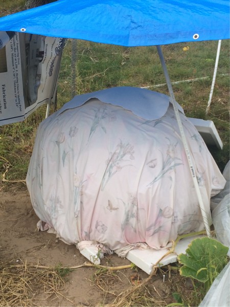Two more weeks. always wait till October second Saturday for 11 mile trip down the road with my old rusty truck and trailer. Got the tent over to keep it dry from the rain tonight and layered up with quilts and sheets The plant still has quite a few green leaves which is good for this time of year for me considering I had a late set on this one July 11. It would be thrilling to get a couple more inches of growth on the fruit