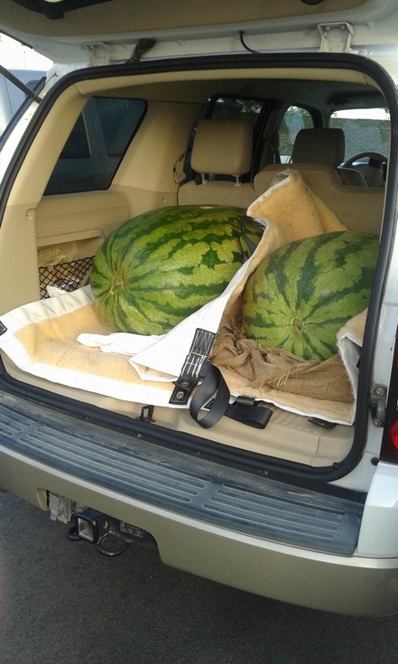 here are a couple very nice melons , one of which was the winner at elkin, both were grown by mr. h.c. williams