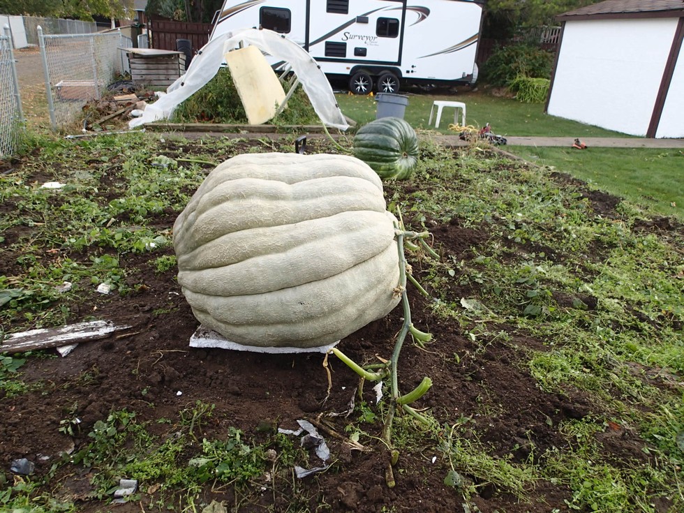 Other side. I wasn't paying attention this year. About September 1st I discovered another squash in the patch. With the dark green colour, leaves and the weeds, I missed this thing. Maybe it's good I have it. The 1236 is thumping pretty good and the skin is starting to split. A bit more growth and I might have had a stem split.