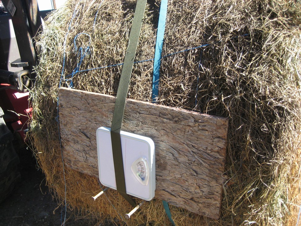 Put 2 large spikes in the hay to hold the scales in the same place when lifting. The idea was to use at least 3 different diameter of rings with the same straps in the same place. This was our low tech method to try and determine side pressure when lifting. The same straps, scales and buckles in the same place on bale. The only thing that changed was the ring on top. This is the 13" ring