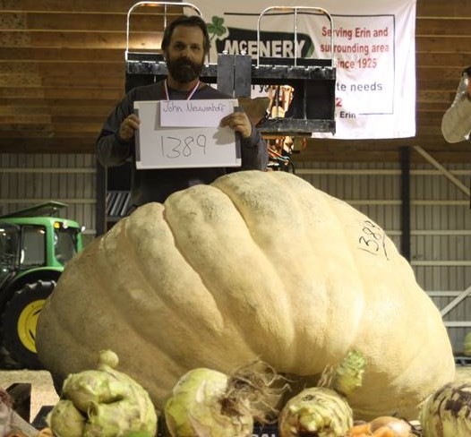 A new PB pumpkin .... 1389 .... only up 3 pounds from a couple years ago, but I'll take it. It went a little heavy and was on the 1381 Checkon crossed with the 2032 Mathison. First place at Erin Fall Fair GPC weigh off. I was so sure I didn't have a PB this year that I bet a good friend of mine that if I did, I would shave off my beard. So this may be the last picture of a bearded me you see for a while. I also got a PB Bushel Gourd of 166 (on the 245 English). A pat on the back goes out to Brian Cleave, a first year gourder, who beat me with a 189 pounder .... a huge BG for our Ontario climate and only 9 pounds short of a Canadian record. When I first bought Bushel Gourd seeds from Quarry Farm Gourds a few years ago they told me not to expect much because with our short season we won't get much over 60 pounds. I guess we showed them, LOL. I also had a 25.8 pound beet, a 69 pound marrow, and a 58 pound rutabaga. I'll post some pictures of the others when the fair is over and I have a few minutes to make the display in front of our house.