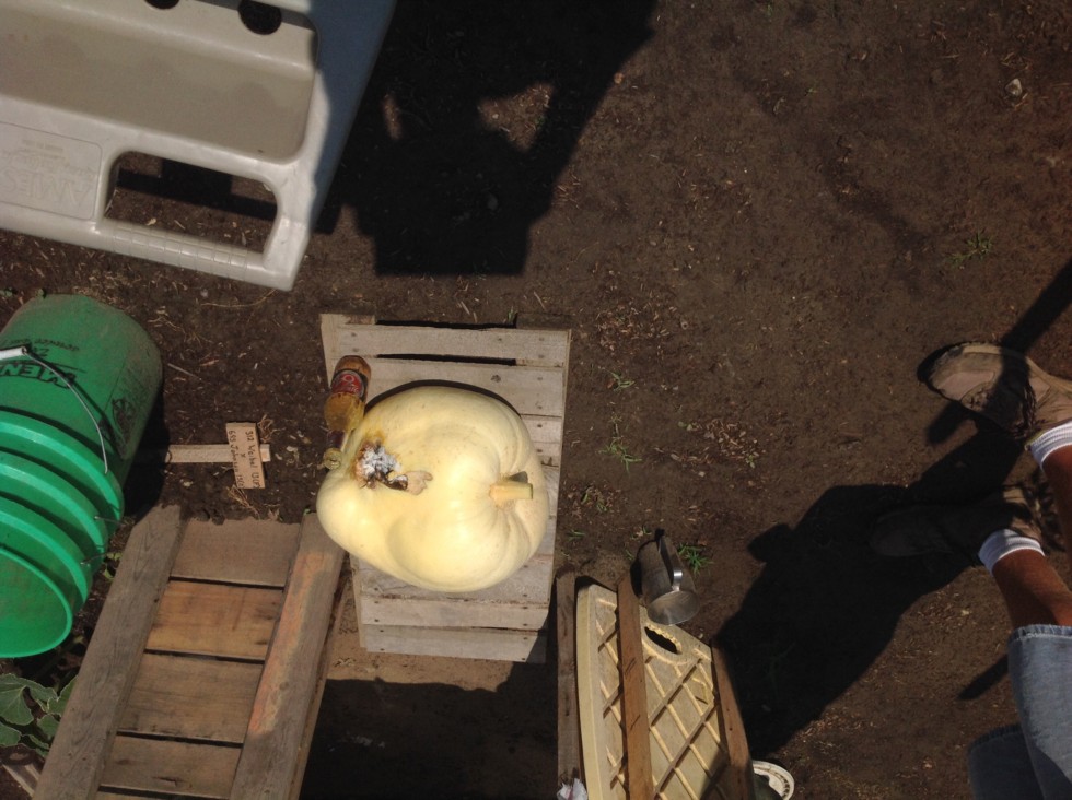 This is one of my pumpkins that rotted at the blossom end. I hope to avoid this from happening again. This is the 39(est) 13 dmg, crossed with the 312 weibel x 695 Johnson. The white stuff is biomin calcium powder; tried to stop the rotting, but did not work. ??
