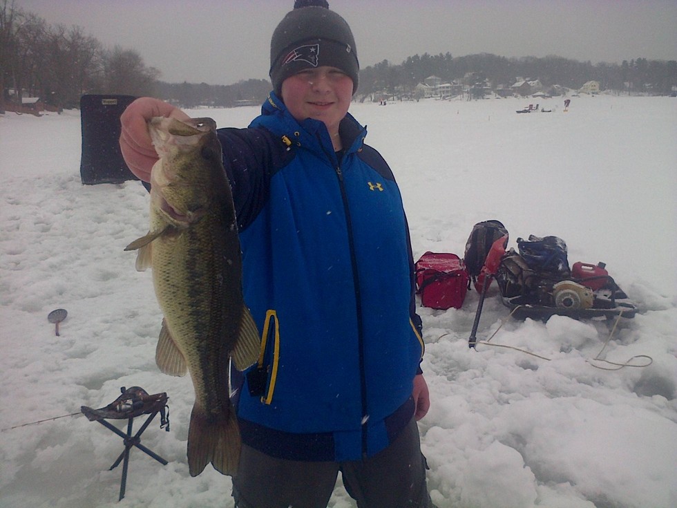 the ice hut saved us from the cold at todays tournament. 6" of slushy mess on top made it tuff walking, with the pending snow storm approaching the fishing was awesome , with about 30 fish caught between us, shawn ended winning 1st place perch, and first place pickerel , of course I placed 4th in the largemouth division, but no money for me,lol. shawn netted over $200+ and won a bass pro gift card in a raffle at the end of the tourney, a great ending to a fun day with my son.