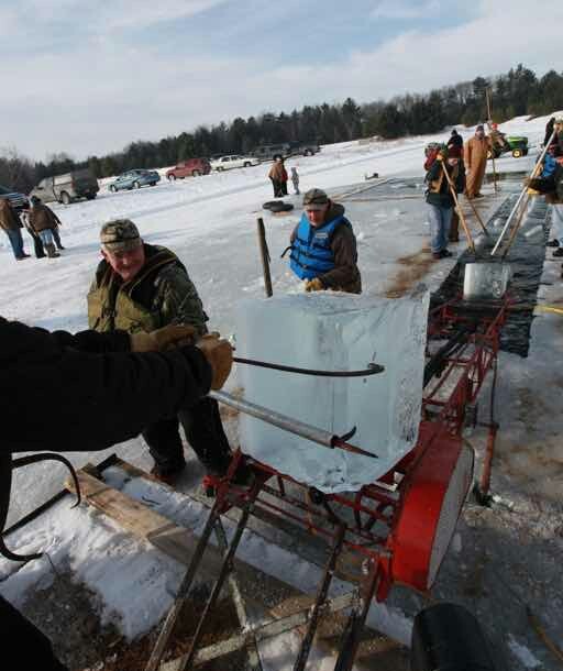Ice blocks were 16 in. thick, they were loaded with an elevator on to trailers.
