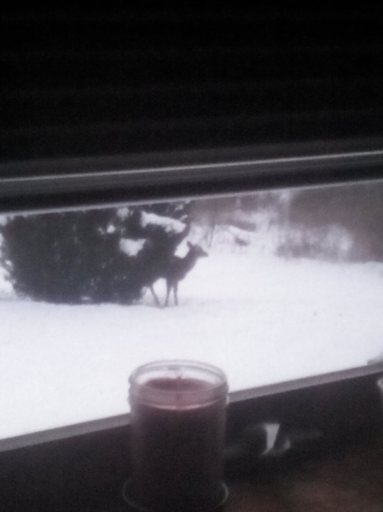 Got yet another friend out the kitchen window .....was a buck I could see where antlers fell off ....must be mad I'm not feeding them they are eating pine bushes lol