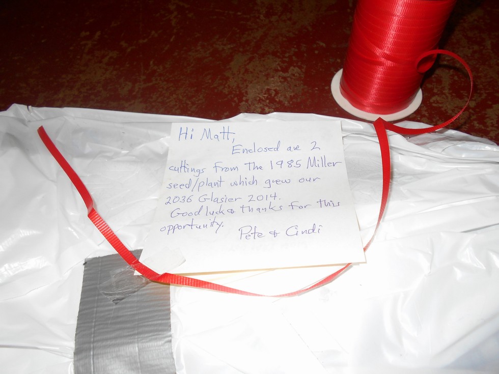 To me the 1985 Miller �13 is a remake of my �Snowball� (220.3 DeBacco �13 F: 2009 Wallace x 1725 Harp [2009 Wallace] clone) and to have this material produce a 2036 pound pumpkin gave me the confidence that I would have a genetic outlier in the proper direction to work into this winters project. It is always nice to get a note from the growers include in the box they send.